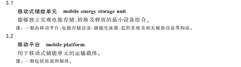 ?。?)《移動式儲能電站通用規(guī)范》GB/T 42715-2023第3.1條、3.2條:移動式儲能電站一般由移動平臺、電能儲存設(shè)備、儲能變流器、監(jiān)控系統(tǒng)及輔助設(shè)備組成。其中移動平臺一般包括底盤和廂體。